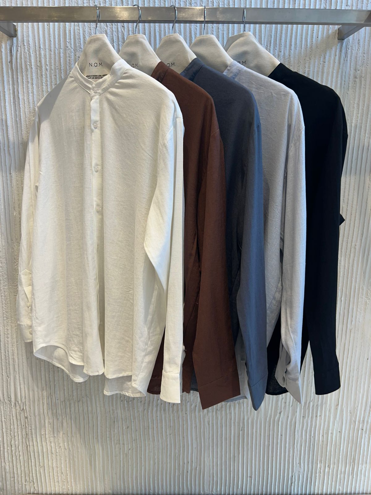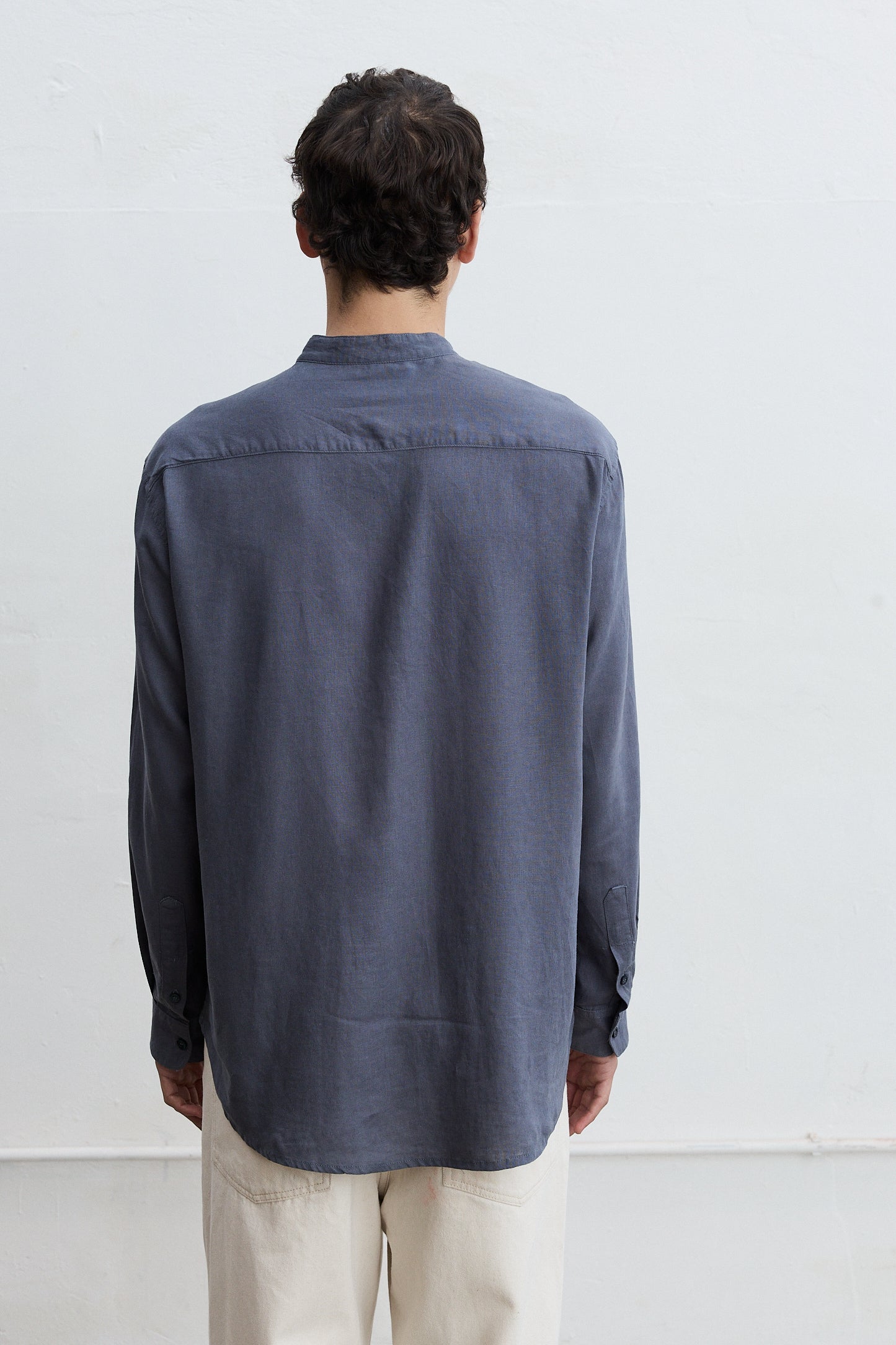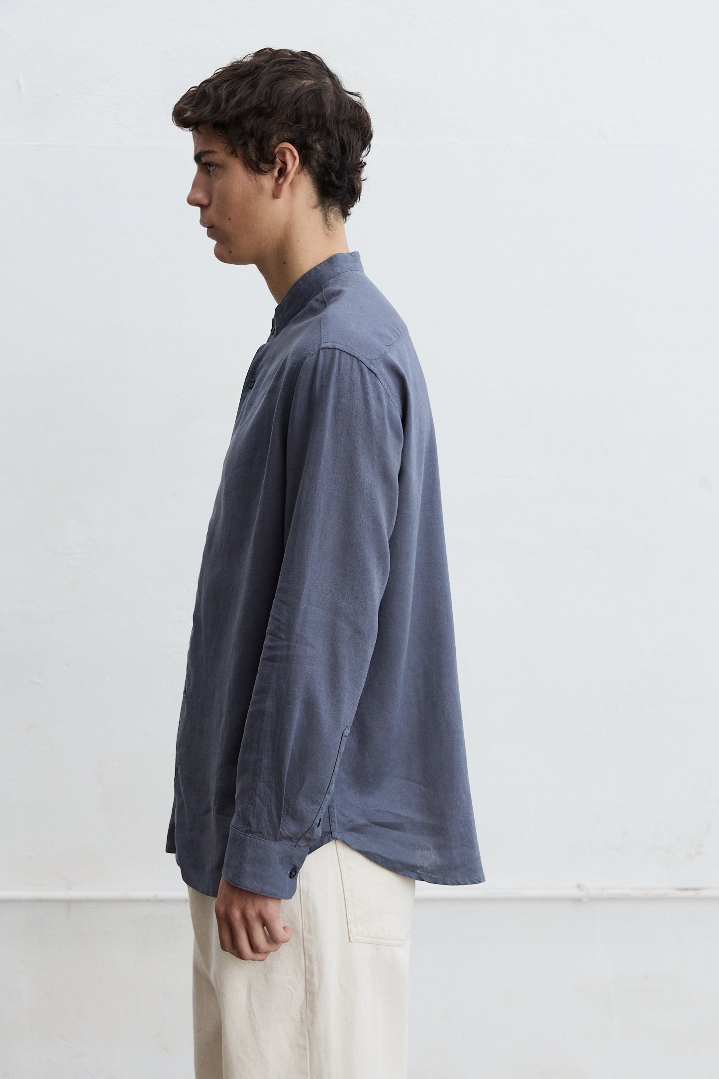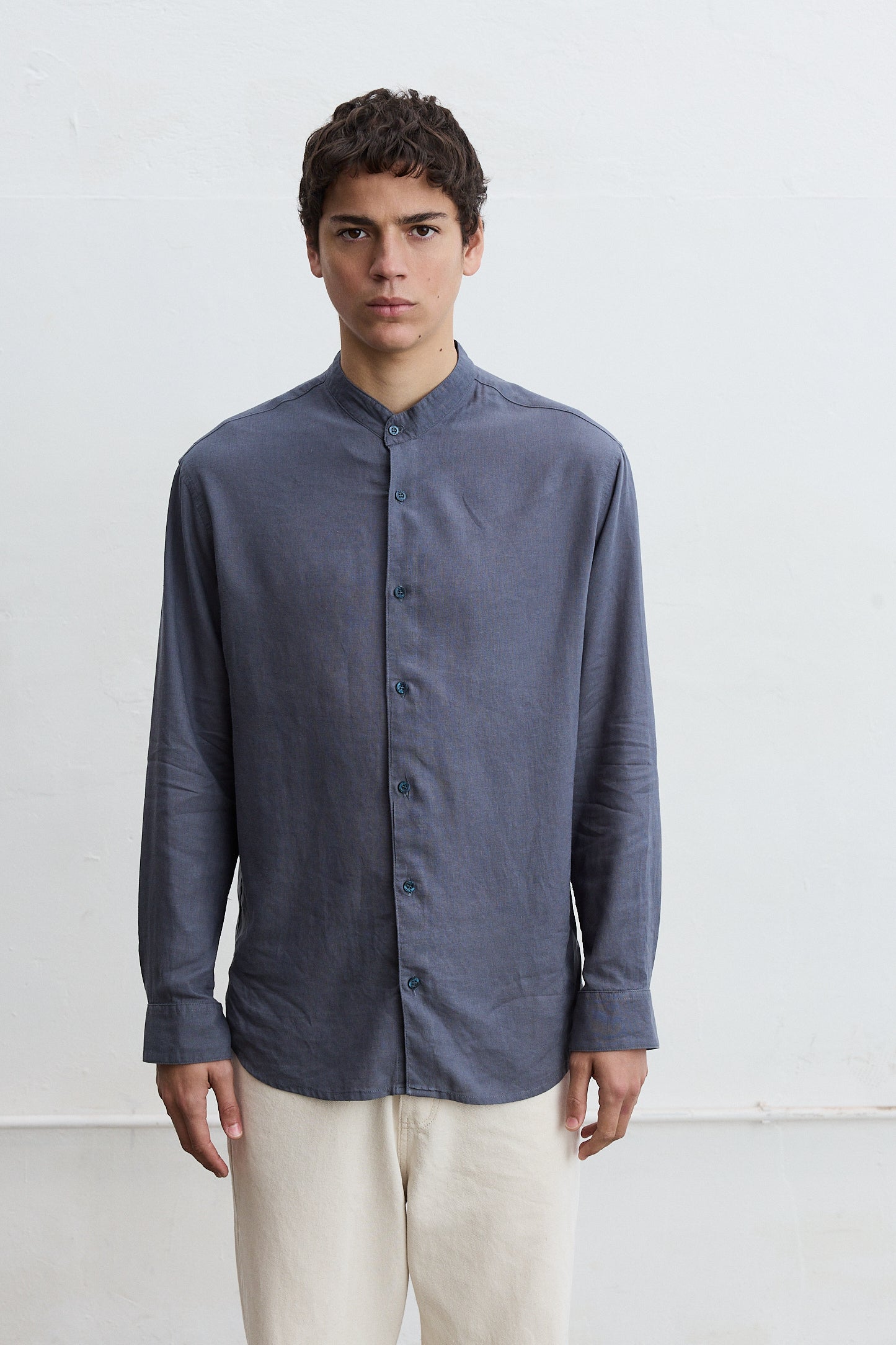 Camisa manga larga cuello mao en lino 100%.