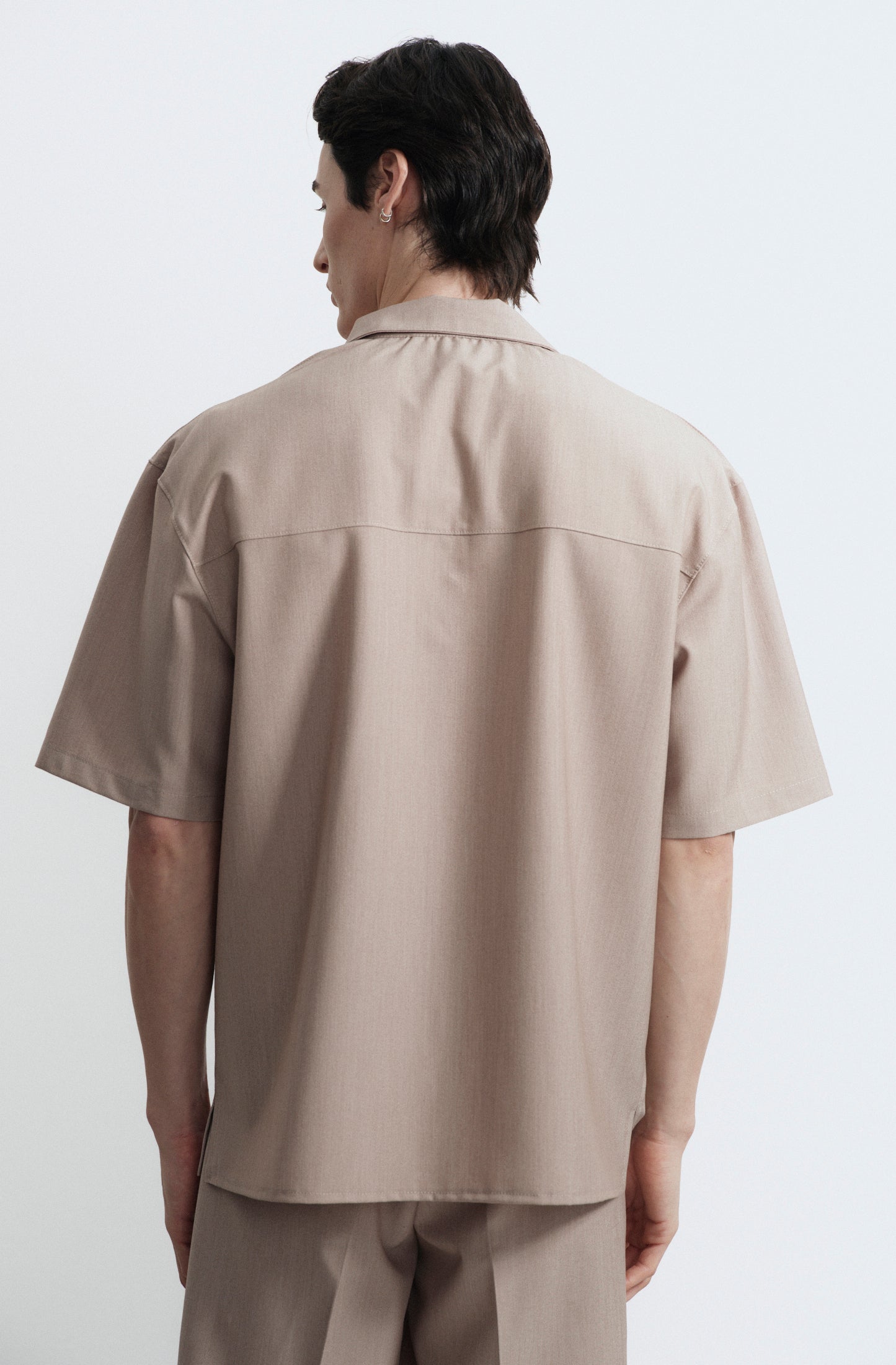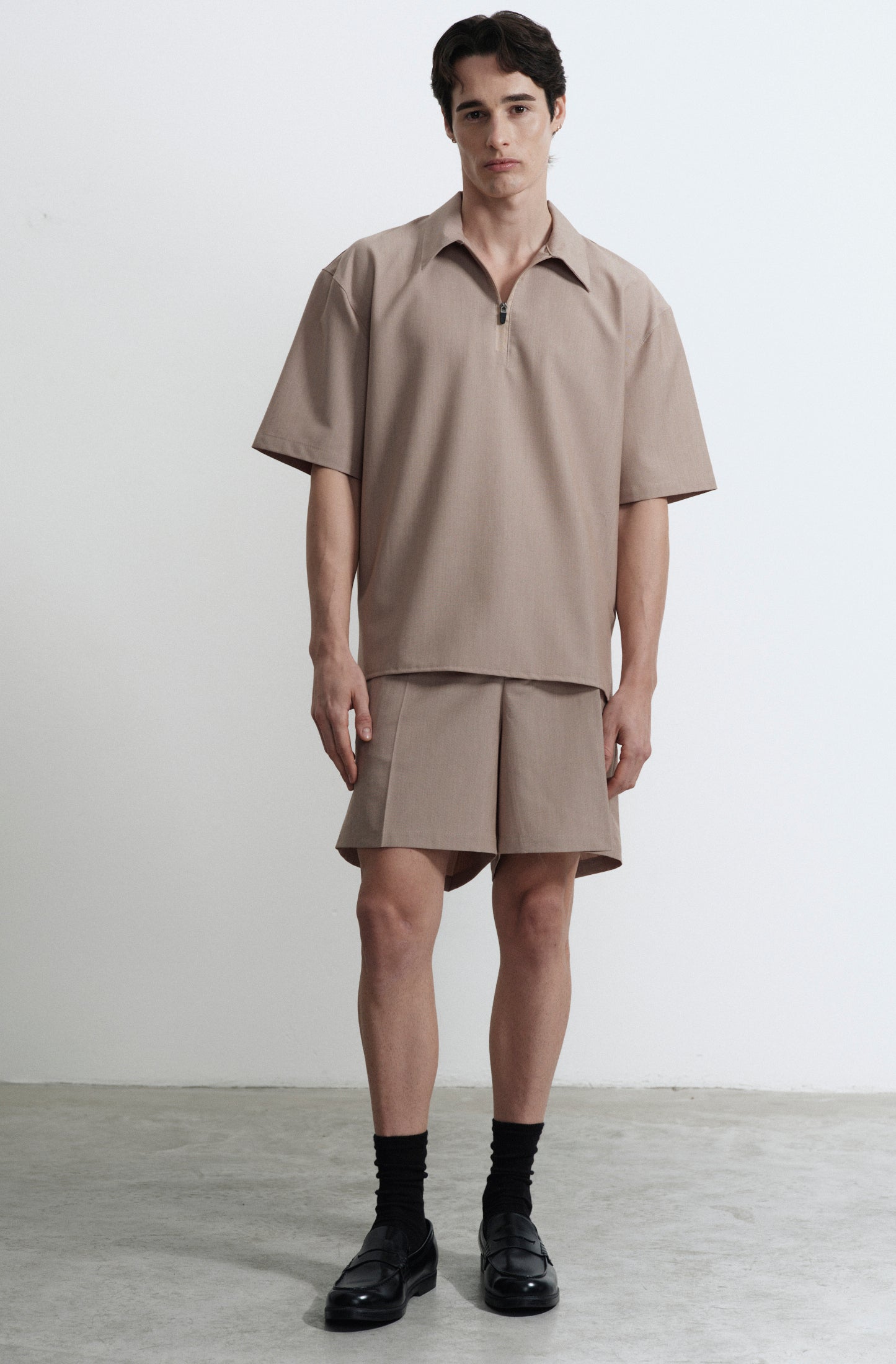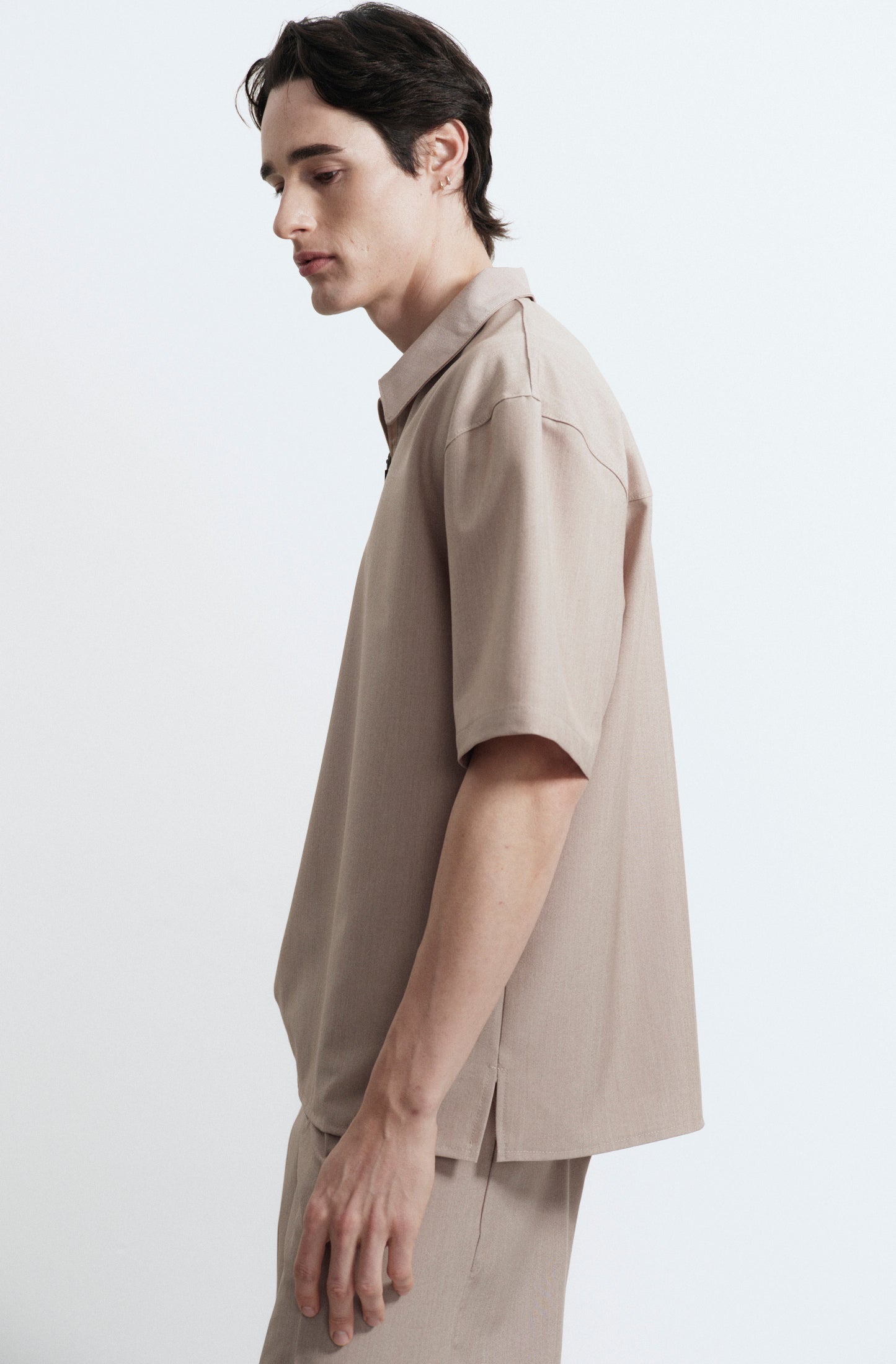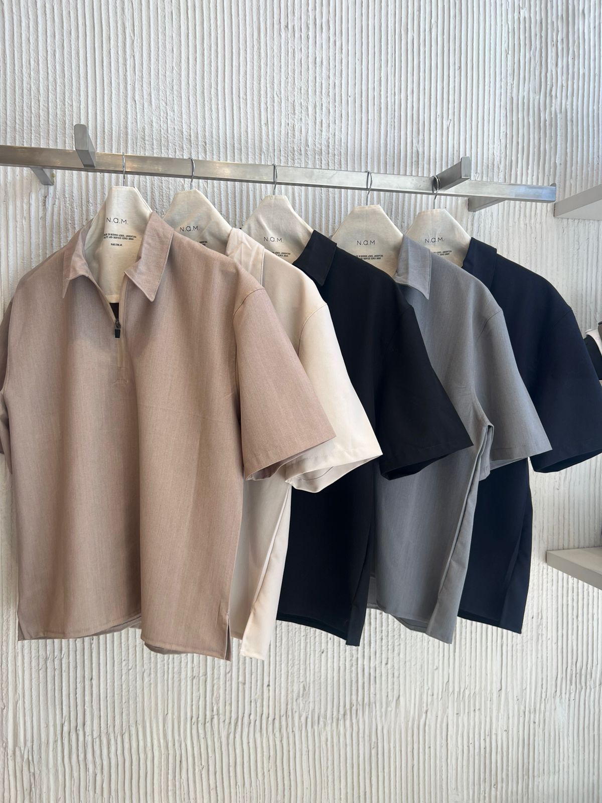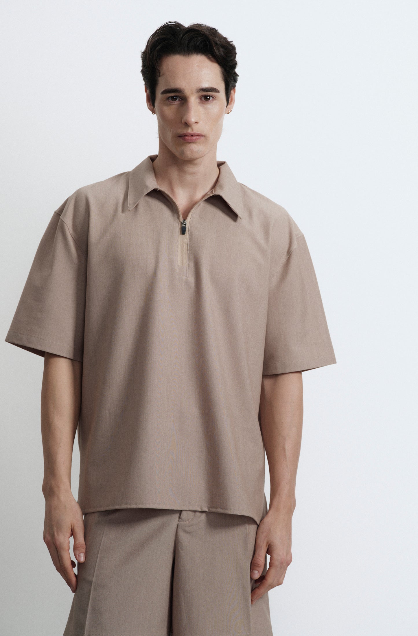Remera con cuello camisero y medio cierre en tela sastrera.